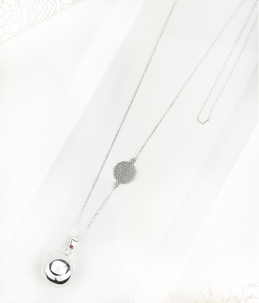 Srebrny naszyjnik z dzwoniącą kulką, której subtelny dźwięk wprowadza spokój i harmonię, tworzy magiczną aurę wokół Ciebie. Możesz nosić go na wysokości piersi lub niżej, aby wydobyć najpiękniejszy dźwięk. Z kolei noszenie go na wysokości splotu słonecznego, pomoże w harmonizacji tej czakry.