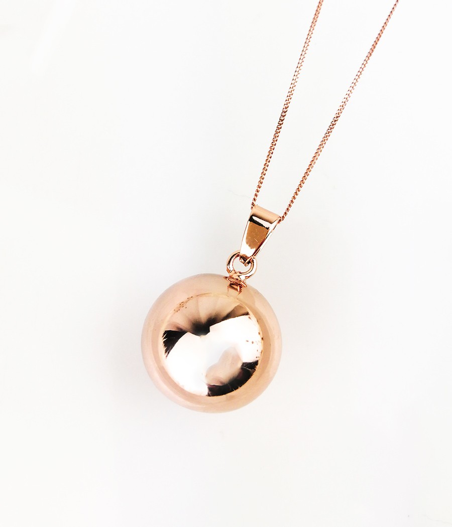 Dzwoniąca kulka: miedź złocona różowym złotem, zabezpieczona impregnatem zapobiegającym