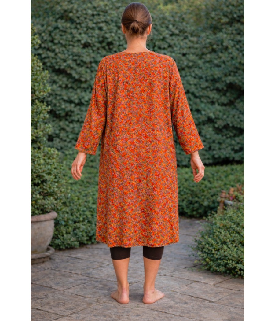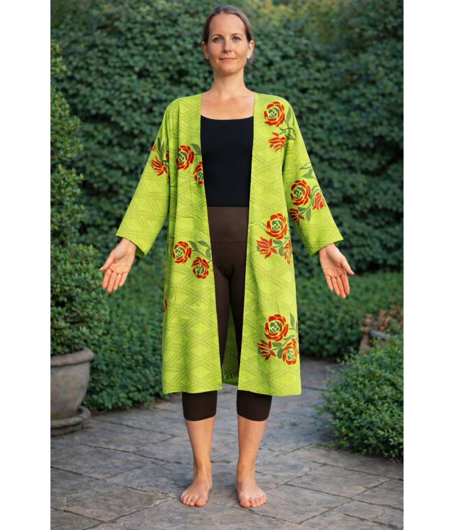 Dwustronny płaszcz 3/4 to połączenie wygody, wyrazistego koloru i codziennej funkcjonalności. Jedna strona przyciąga uwagę intensywną zielenią z roślinnym, kwiatowym motywem, druga zachwyca ciepłym odcieniem pomarańczu z delikatną, nieregularną strukturą wzoru. Prosty, otwarty fason bez zapięcia swobodnie układa się na sylwetce i daje dużą swobodę ruchu. Długość tuż za kolano sprawia, że płaszcz jest uniwersalny – sprawdzi się zarówno jako lekka narzutka, jak i element stylizacji na chłodniejsze dni. Rękawy o długości 3/4 podkreślają lekkość formy, a dwustronność pozwala jednym ruchem zmienić charakter całości – od świeżego i energetycznego po bardziej stonowany i ciepły. To model dla osób, które lubią kolor, prostotę kroju i możliwość wyboru nastroju bez zmiany ubrania.