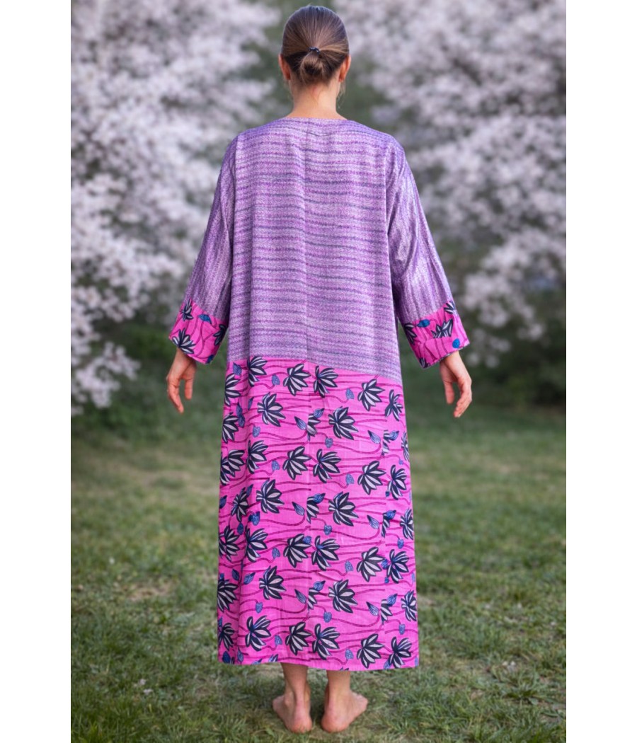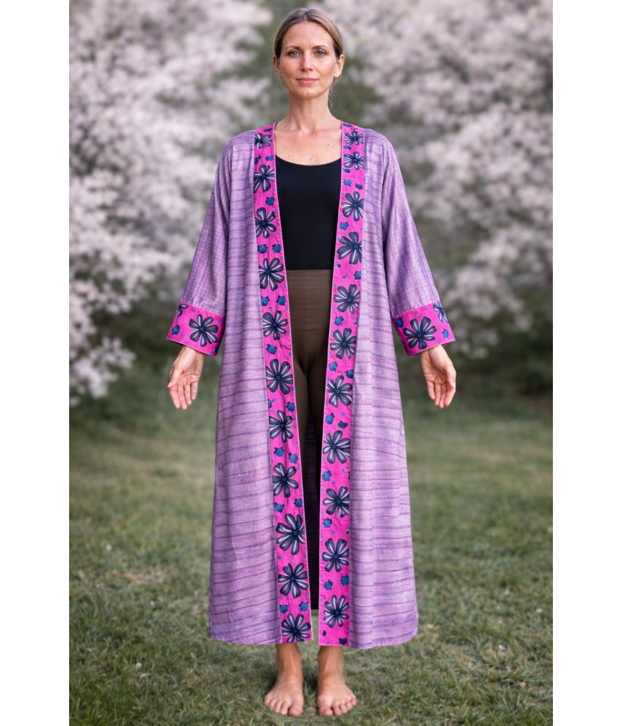 Ten dwustronny płaszcz–kimono to jeden model, który daje dwie zupełnie różne odsłony stylu. Z jednej strony intensywna, energetyczna zieleń z dynamicznym wzorem, z drugiej – fioletowo-różowa kompozycja z kwiatowym charakterem. Wystarczy odwrócić płaszcz, by zmienić klimat stylizacji – bez przebierania, bez dodatkowych ubrań.