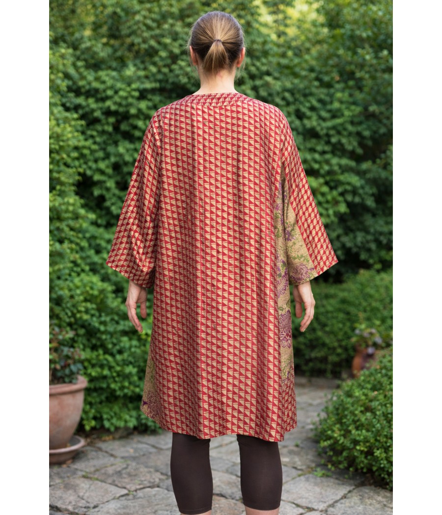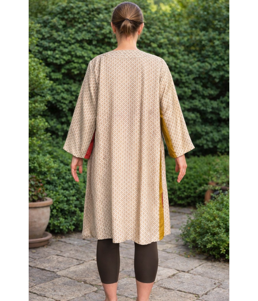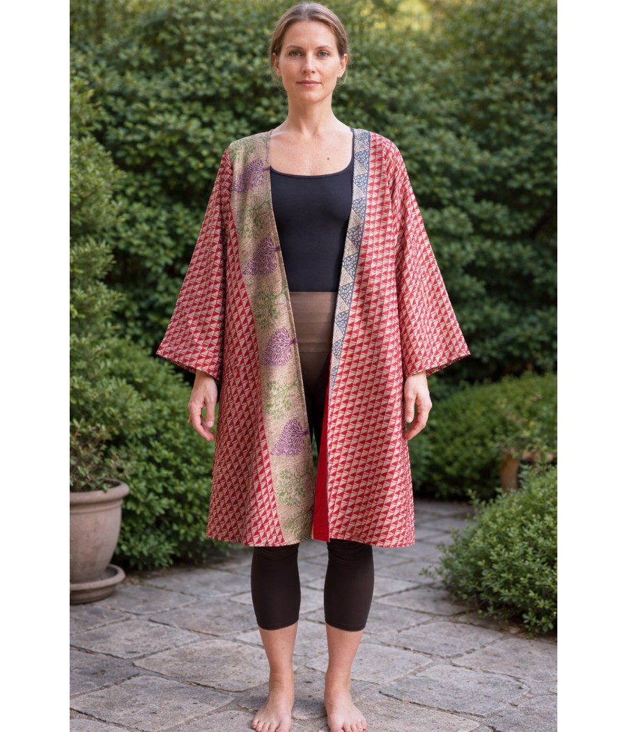 Dwustronny płaszcz w stylu kimona o kroju 3/4 to propozycja dla osób ceniących wyraziste detale i spokojną, ponadczasową formę. Jedna strona utrzymana jest w ciepłej tonacji beżu i złota z delikatnym, geometrycznym wzorem, druga – w głębokiej czerwieni i złota z drobnym motywem, który nadaje całości charakteru i energii. Kontrastowe lamówki w odcieniach czerwieni i złota podkreślają linię płaszcza i dodają mu elegancji.