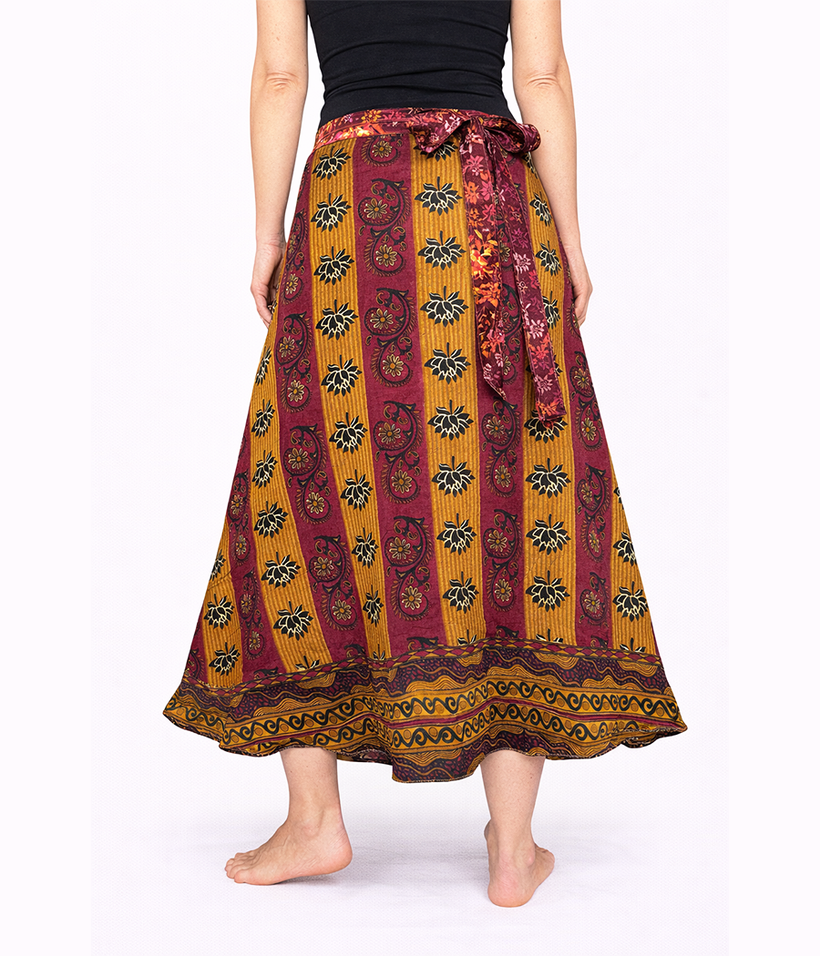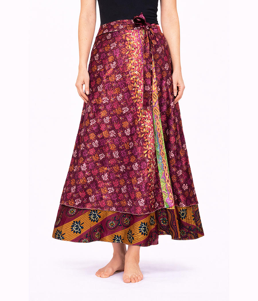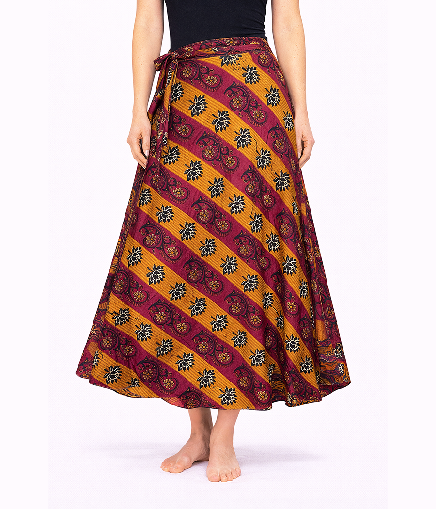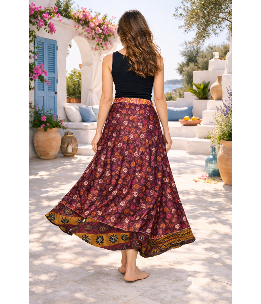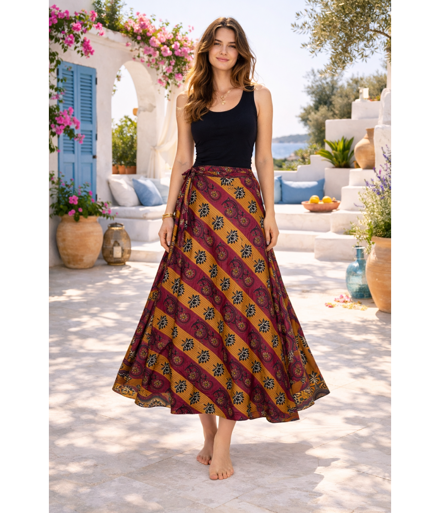 Dwustronna spódnica z indyjskiego jedwabiu to wyjątkowa propozycja dla kobiet, które kochają wolność stylu i naturalne piękno tkanin. Wystarczy jeden ruch, aby zmienić jej charakter – jedna strona zachwyca subtelnym, drobnym wzorem kwiatowym w głębokich odcieniach burgundu i złota, druga przyciąga wzrok wyrazistym, orientalnym motywem w ciepłych barwach. Dzięki temu możesz tworzyć zupełnie różne stylizacje, mając w szafie jedno ubranie.