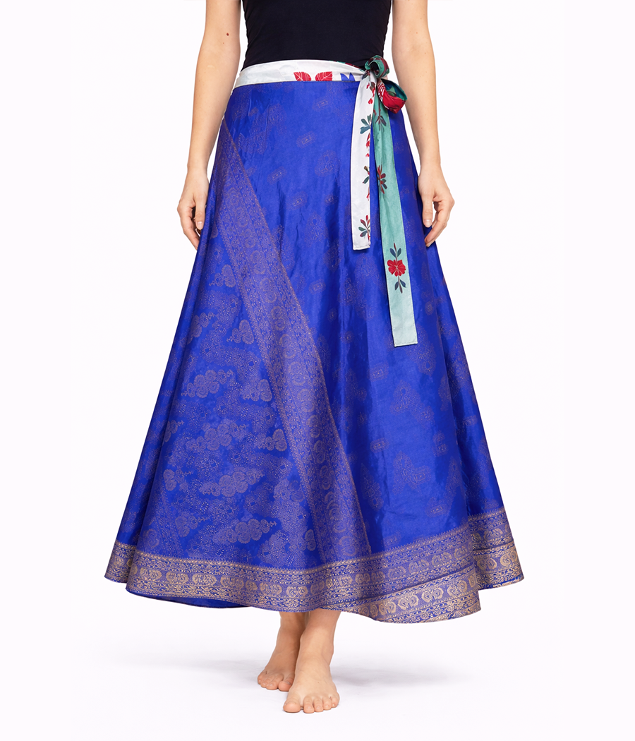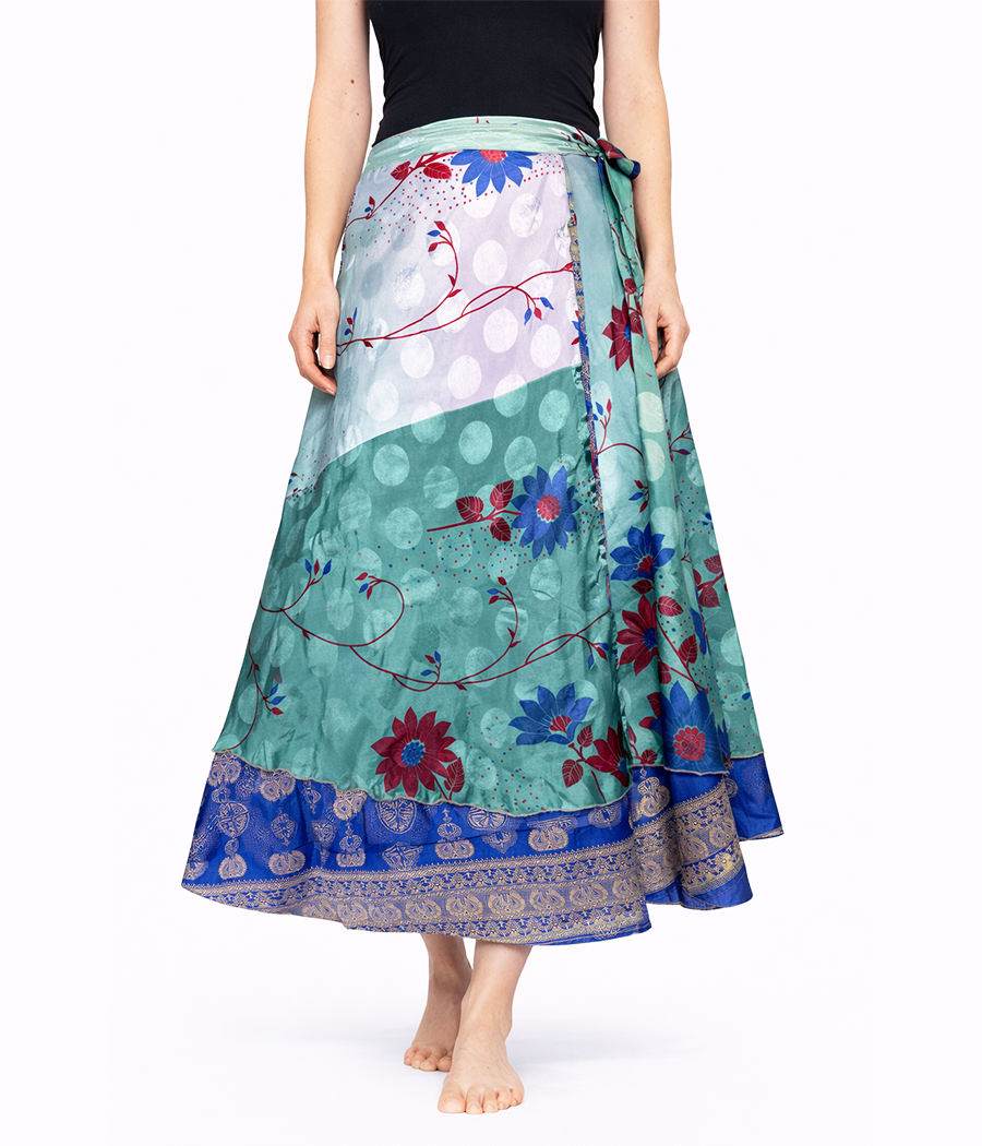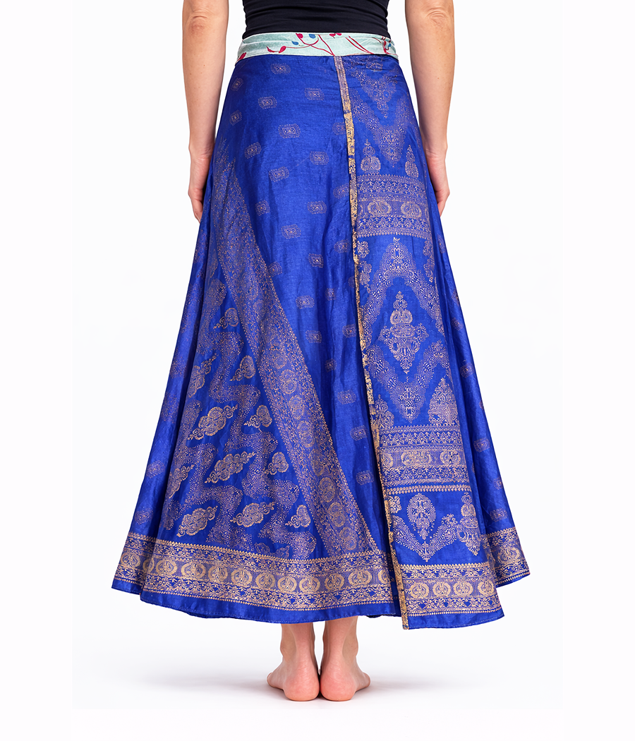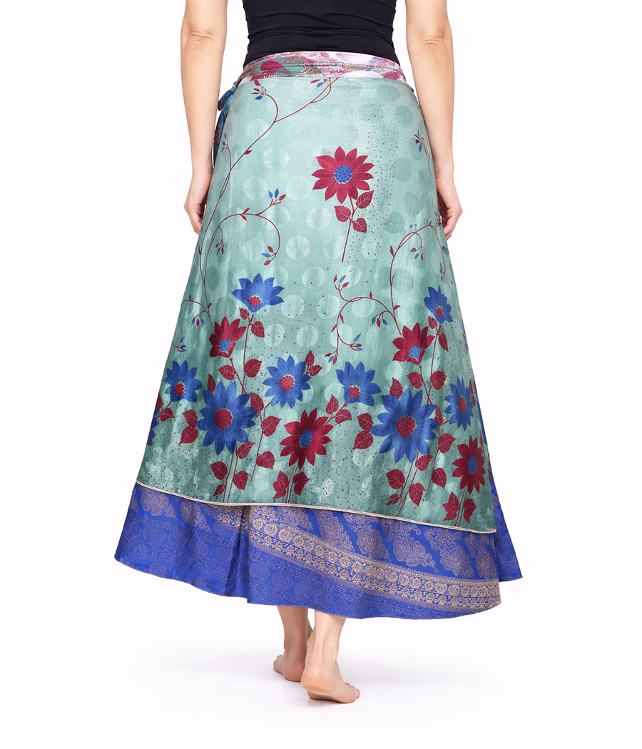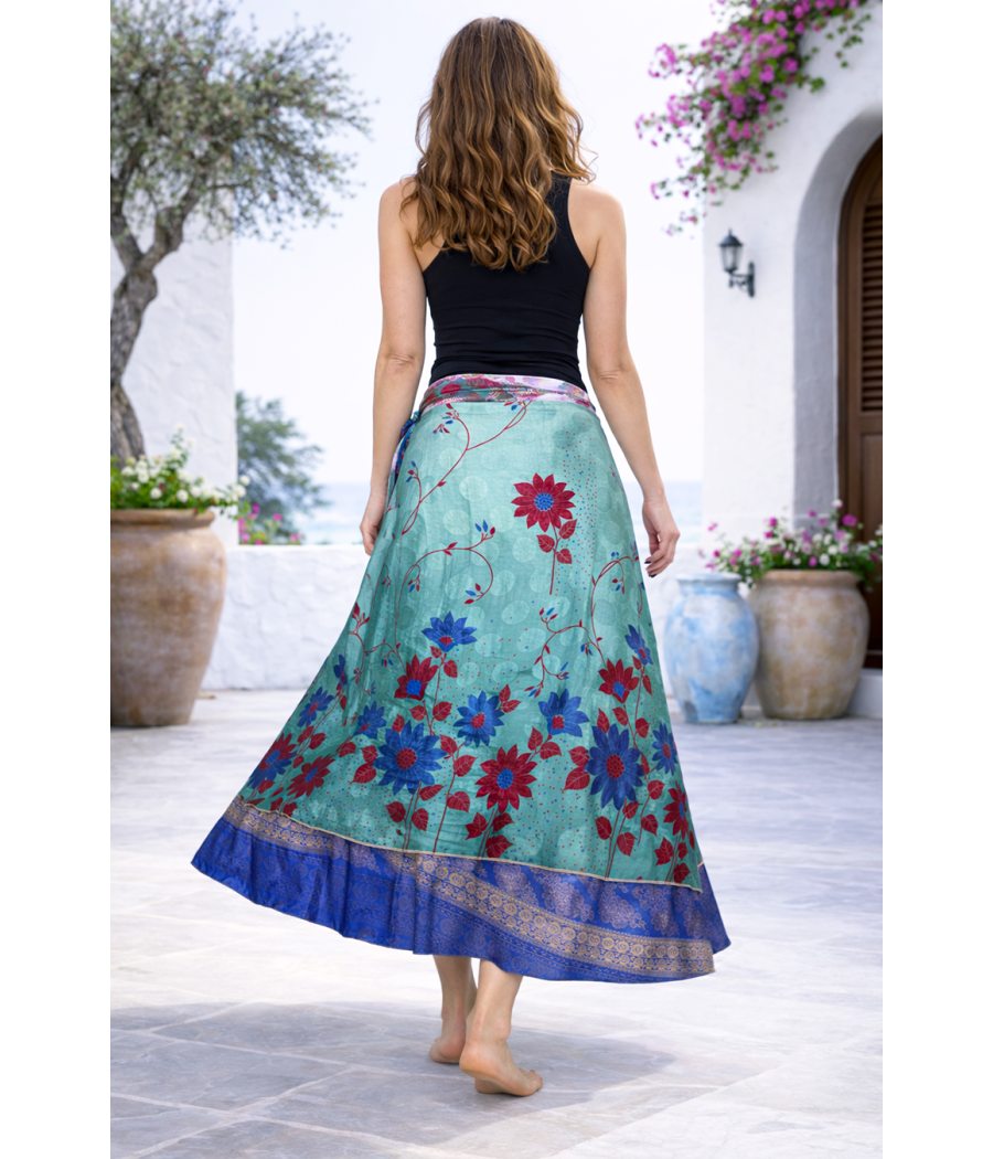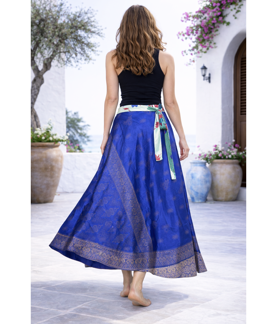 Dwustronna spódnica z jedwabiu indyjskiego – turkusowe kwiaty / chabrowy