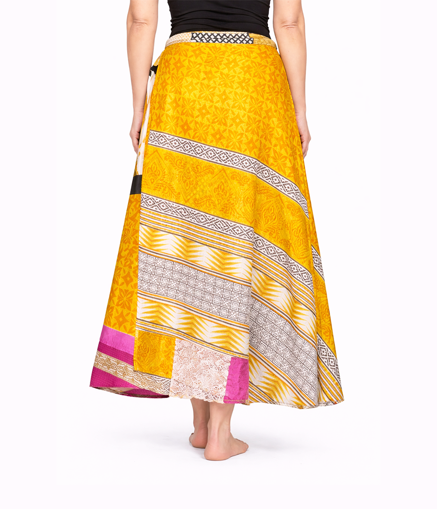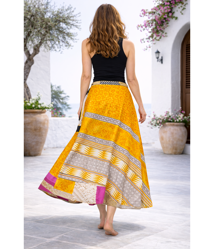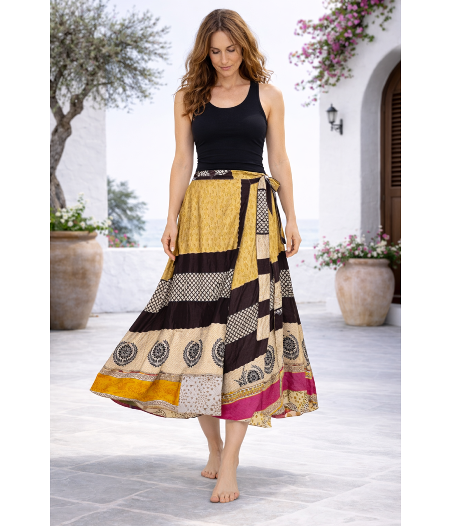 Dwustronna spódnica z jedwabiu indyjskiego pozwala tworzyć dwie zupełnie różne stylizacje w jednym ubraniu. Z jednej strony zachwyca intensywnym chabrowym kolorem z geometrycznym wzorem i ozdobnym bordiurem, z drugiej odsłania zupełnie inny charakter – dzięki czemu możesz zmieniać jej wygląd w zależności od nastroju lub okazji.
