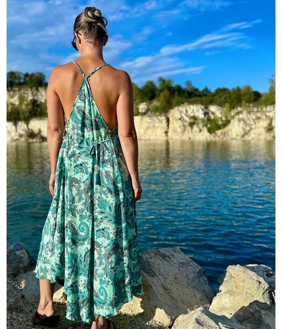 Ta długa sukienka z rayonu jest idealnym wyborem! Dzięki miękkiemu i delikatnemu w dotyku materiałowi będziesz czuć się wyjątkowo i komfortowo przez cały dzień. Regulowane ramiączka pozwalają na idealne dopasowanie sukienki do Twojej sylwetki. Możesz ją nosić luźno albo przewiązać dodatkowo wokół pasa sznureczkiem.
