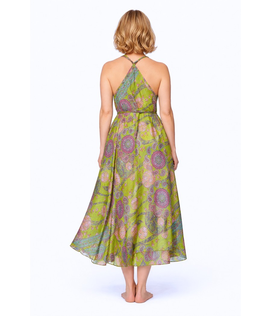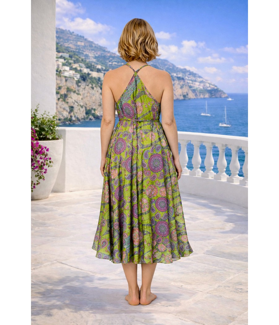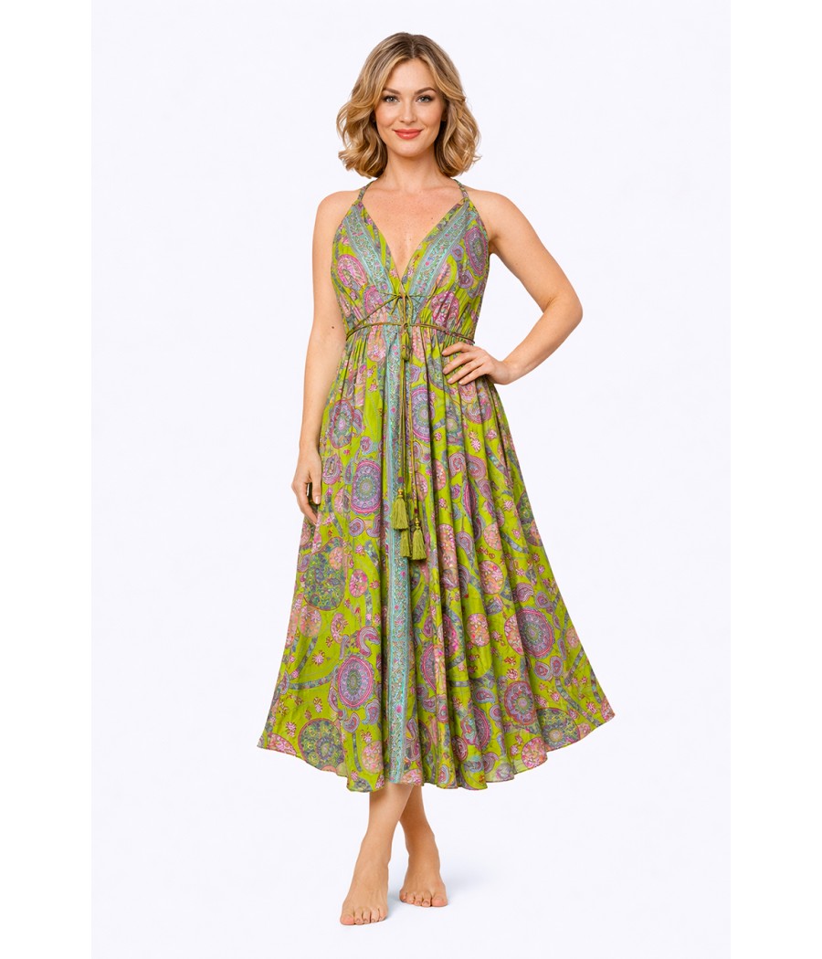 Dekolt w kształcie litery V subtelnie podkreśla linię szyi i ramion, natomiast wiązanie w talii pozwala dopasować sukienkę do sylwetki. Delikatne ramiączka skrzyżowane na plecach dodają jej zmysłowości i lekkości. Całość dopełnia bogaty, orientalny wzór inspirowany indyjską sztuką – pełen zieleni, turkusu i różowych akcentów, które tworzą energetyczną, harmonijną kompozycję.